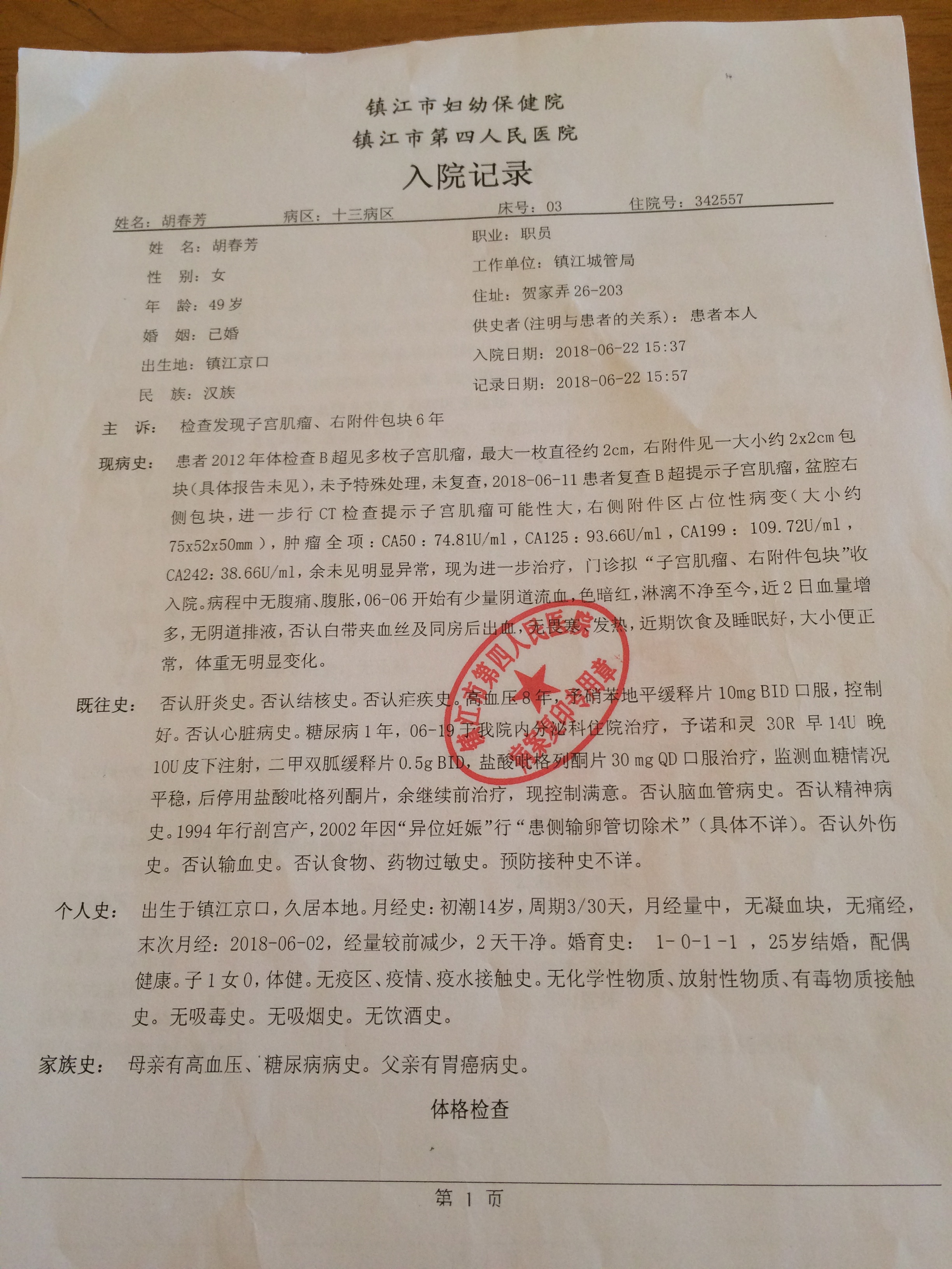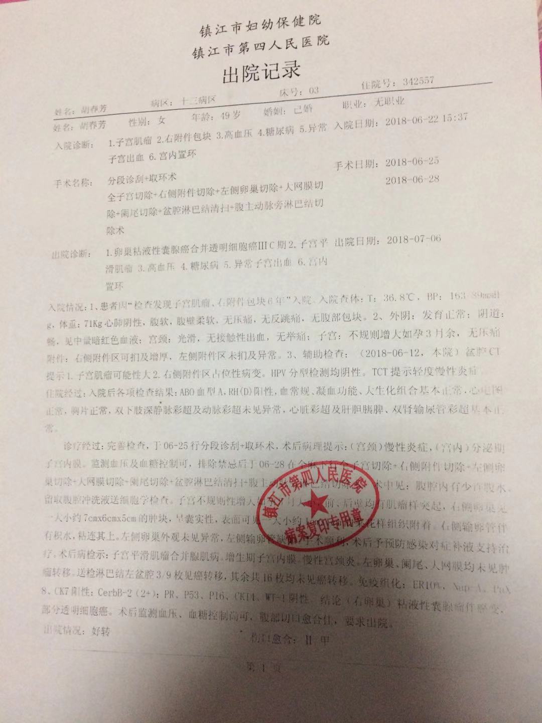 我叫胡春芳,江苏镇江人,卵巢癌3C期,送检淋巴结左盆腔3/9枚癌转移,卵巢癌粘液性囊腺癌合并透明细胞癌3C期,很严重,还有高血压糖尿病,2018年6月住院,降血糖在内分泌科,费用4千多,手术妇科全切除2万4,化疗已8个疗程16万,复发就要重复手术、化疗。现在筹款用于定期CT等检查、化验,抗癌药、靶向药,并为以后复发的化疗、手术筹资,希望好心人帮帮我,我想多活几年。
