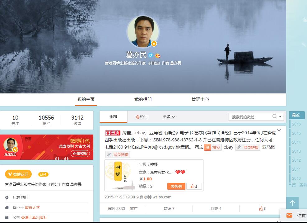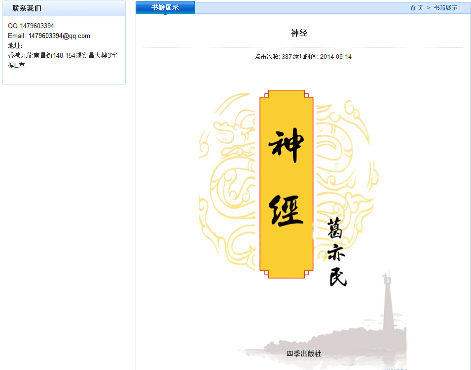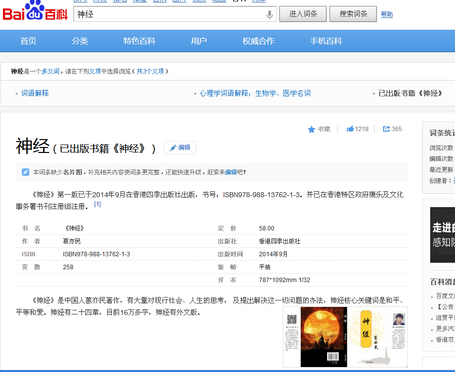 新闻荣誉第1季 新闻荣誉第2季1、神经第一版已于2014年9月在香港四季出版社出版,书号:ISBN978-988-13762-1-3 神经已在香港特区政府康乐及文化事务署书刊注册组注册。 )1、